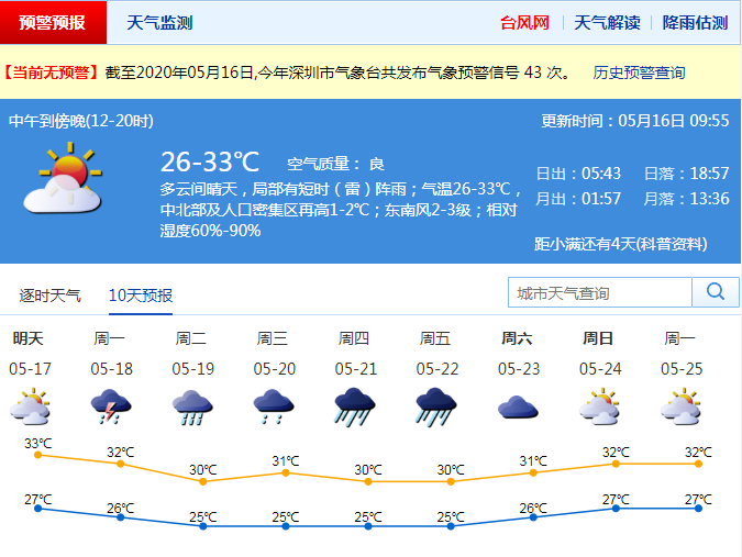 見圳客戶端·深圳新聞網(wǎng)2020年5月16日訊 深圳市氣象臺預(yù)報,周末天氣悶熱局部有短時(雷)陣雨下周轉(zhuǎn)趨多降雨天氣:周末期間(16-17日)多云間晴天,天氣悶熱,局部地區(qū)有短時(雷)陣雨,氣溫27-33℃,中北部最高氣溫可達35℃左右;下周轉(zhuǎn)趨多降雨天氣,其中18-19日有中到大雨局部暴雨,伴有短時強降雨、短時大風(fēng)。