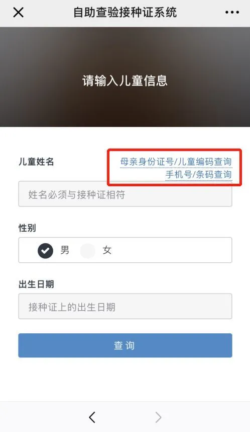 錄入兒童基本信息,可選擇手機(jī)號(hào)或條碼查詢: