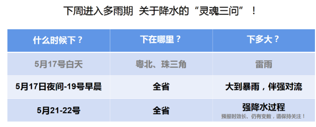 17日夜間到19日早晨,珠三角、粵東和陽江、茂名有大雨到暴雨,其余市縣有大雨局部暴雨;雷雨時伴有8級左右的短時大風。
