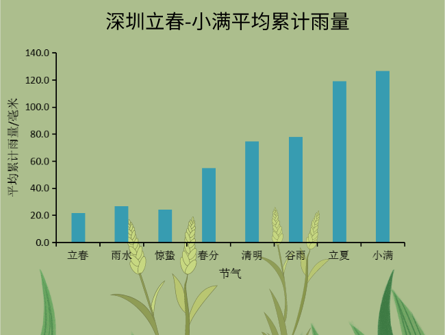 小滿節(jié)氣,除了氣溫不斷地攀升,雨水也逐漸增多。伴隨著南海夏季風(fēng)的爆發(fā),所謂小滿大滿,江河水滿,意思是小滿節(jié)氣強(qiáng)降水過程頻繁,間隔時(shí)間短,經(jīng)常一波接一波。進(jìn)入小滿節(jié)氣后,深圳也進(jìn)入了一年一度的“龍舟水”時(shí)期。此時(shí)南方的暖濕氣流活躍,與北方南下的冷空氣交匯,往往會出現(xiàn)持續(xù)大范圍的強(qiáng)降水。氣象統(tǒng)計(jì)數(shù)據(jù)顯示,小滿節(jié)氣后15天深圳平均累計(jì)雨量為126.9毫米,比之前的立夏時(shí)節(jié)降水更加豐沛。