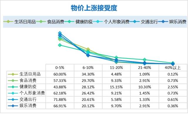 調(diào)研發(fā)現(xiàn),對(duì)于生活日用品、食品消費(fèi)、個(gè)人形象消費(fèi)、交通出行、娛樂(lè)消費(fèi)等各項(xiàng)消費(fèi),大部分消費(fèi)者能接受的價(jià)格上漲幅度在5%以內(nèi)。而健康防疫物資方面,43.88%的消費(fèi)者接受5%以內(nèi)的漲幅,28.12%的消費(fèi)者接受6-10%的漲幅,15.15%的消費(fèi)者接受11-20%的漲幅,即消費(fèi)者能接受防疫物資價(jià)格較大幅度的上漲。