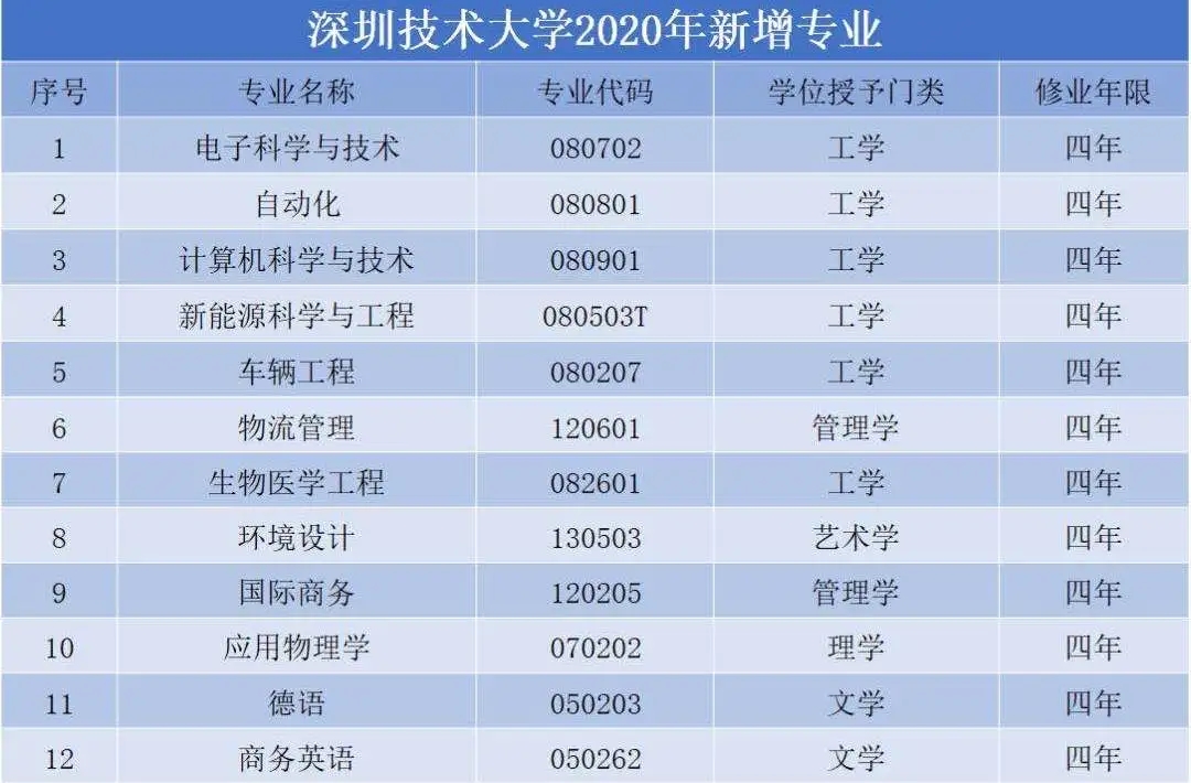 據(jù)教育部2019年本科專業(yè)備案和審批結(jié)果,在2019年機(jī)械設(shè)計(jì)制造及其自動(dòng)化、物聯(lián)網(wǎng)工程、光源與照明、交通運(yùn)輸、汽車服務(wù)工程、工業(yè)設(shè)計(jì)等6個(gè)專業(yè)的基礎(chǔ)上,2020年,深圳技術(shù)大學(xué)將新增12個(gè)專業(yè),屆時(shí)招生專業(yè)將達(dá)18個(gè)。