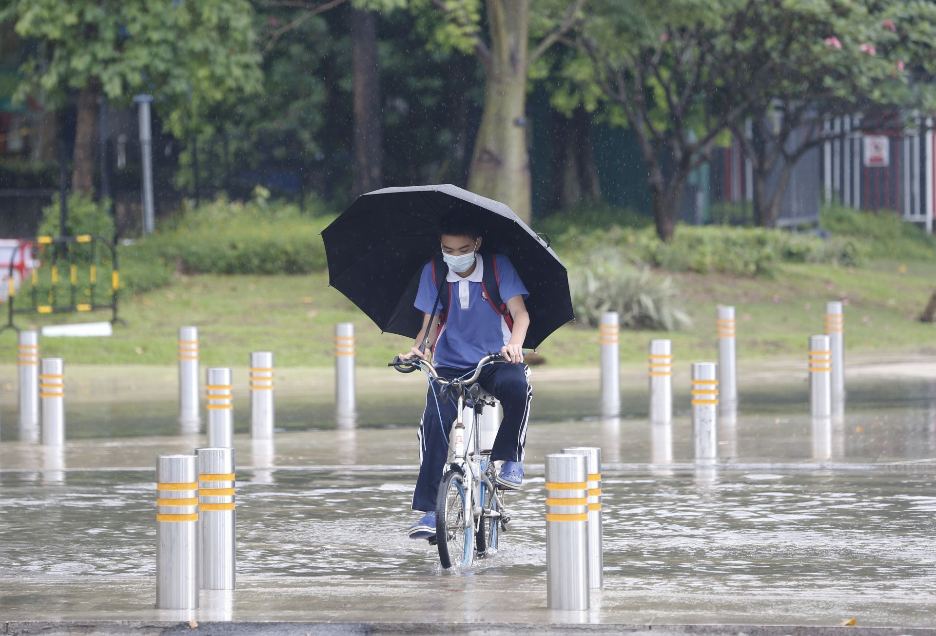2020年5月26日中午13:27分,香梅路與紅荔西路交界處人行橫道,一名學(xué)生騎車小心翼翼經(jīng)過。