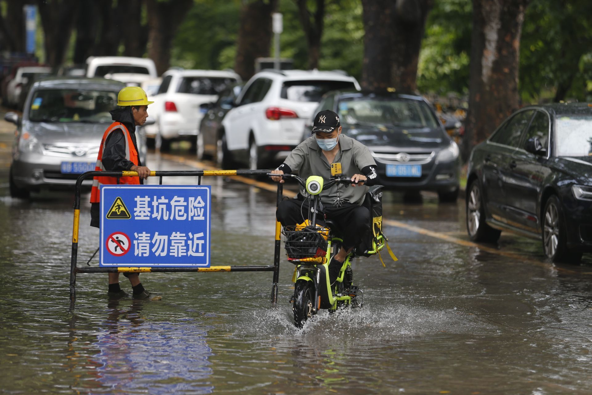 2020年5月26日中午13:46分,商報東二路,短時強降水導(dǎo)致路面水浸,一位騎士經(jīng)過水浸路面。