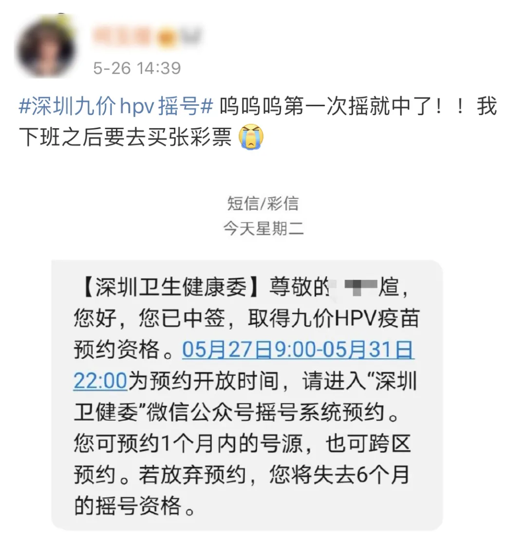 “嗚嗚嗚……簡直不敢相信我的眼睛,前段時間連口罩都抽不中的我,竟然抽中了九價HPV疫苗”。