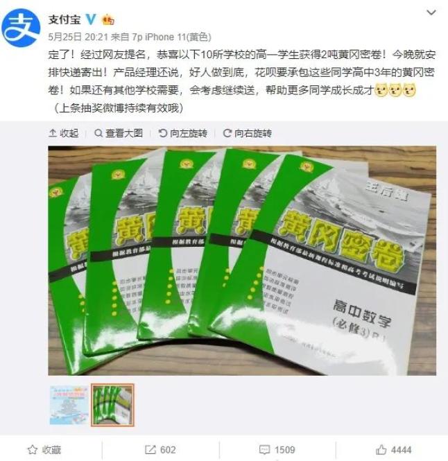 前段時(shí)間,支付寶發(fā)布了學(xué)雜費(fèi)支持分期的微博,評(píng)論里有家長(zhǎng)在呼喚學(xué)習(xí)資料,所以花唄產(chǎn)品經(jīng)理決定除了學(xué)雜費(fèi)分期,再買2噸黃岡密卷送人。