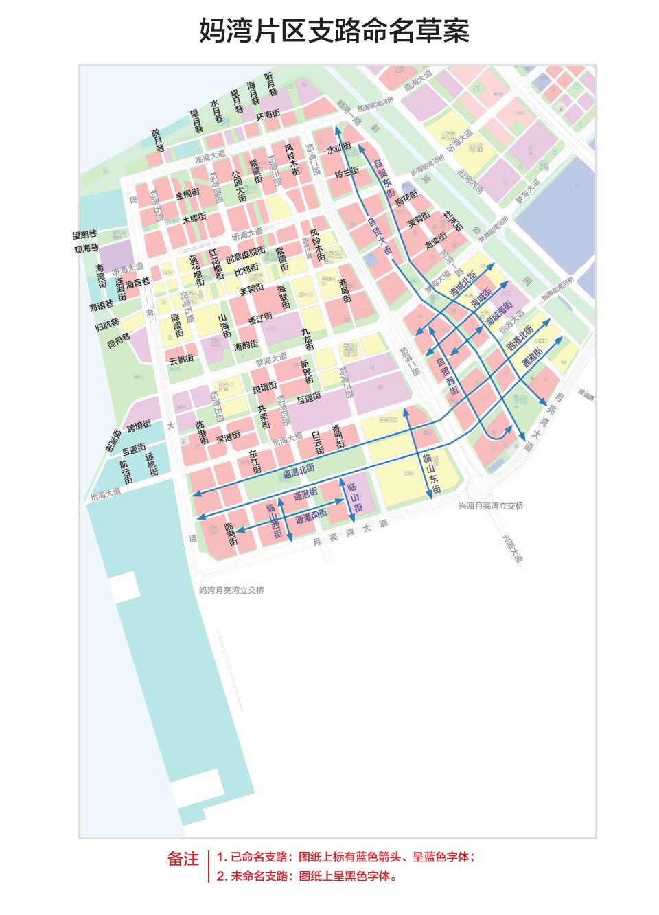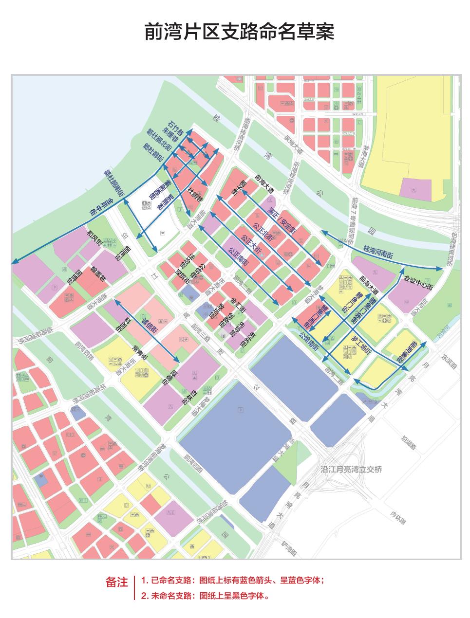 其中,桂灣片區(qū)共約37條(包括已命名支路13條,本次擬定支路命名草案24條),前灣片區(qū)約39條(包括已命名支路20條,本次擬定支路命名草案19條),媽灣片區(qū)共61條(包括已命名支路12條,本次擬定支路命名草案49條)。同時,將代表前海門戶通道的主干道“前灣一路”更名為“前海大道”。