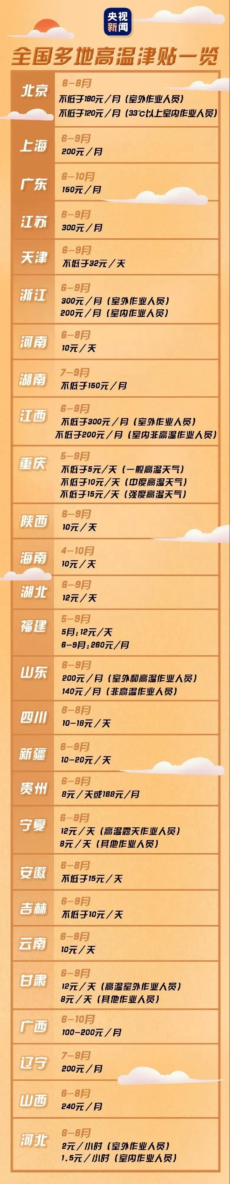 部分省份高溫津貼發(fā)放標(biāo)準(zhǔn)如下: