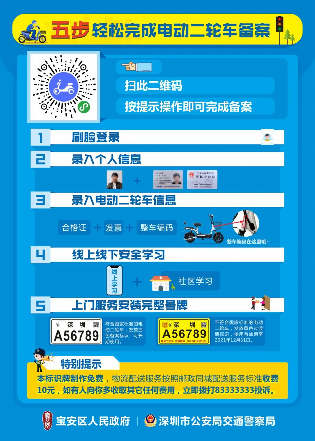 見圳客戶端·深圳新聞網(wǎng)2020年6月2日訊(見圳客戶端、深圳新聞網(wǎng)記者 鄭曉鵬)近日,網(wǎng)上流傳著這樣一張圖片,圖片上稱,6月1日起寶安、光明電動(dòng)二輪車備案通道要關(guān)閉了。消息一出,便引起網(wǎng)友的廣泛關(guān)注“真的假的?”“那我的電動(dòng)車還能上牌嗎?”“超標(biāo)車是什么車?合標(biāo)車又是什么車?”……記者從深圳市交警局獲悉,6月15日起,寶安區(qū)和光明區(qū)超標(biāo)的電動(dòng)二輪車將不再予以發(fā)放黃色過渡期標(biāo)識(shí);對(duì)于符合新國標(biāo)標(biāo)準(zhǔn)的車輛,市民持深圳戶籍身份證或居住證即可辦理電動(dòng)二輪車備案,發(fā)放可長(zhǎng)期使用的白色標(biāo)識(shí)。已備案的并發(fā)放黃牌標(biāo)識(shí)的車輛仍可繼續(xù)使用,過渡期至2021年12月31日。