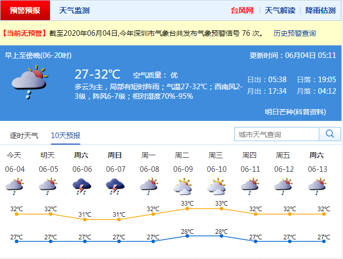見(jiàn)圳客戶端·深圳新聞網(wǎng)2020年06月04日訊 深圳今日天氣多云為主,局部有短時(shí)陣雨;氣溫27-32℃;西南風(fēng)2-3級(jí),陣風(fēng)6-7級(jí);相對(duì)濕度70%-95%