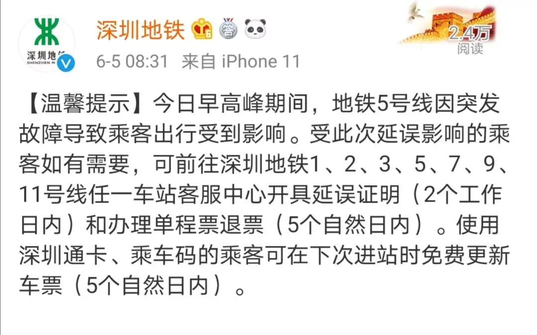 隨后,深圳地鐵官方微博發(fā)布溫馨提示,今日(6月5日)早高峰期間,地鐵5號(hào)線因突發(fā)故障導(dǎo)致乘客出行受到影響。受此次延誤影響的乘客如有需要,可前往深圳地鐵1、2、3、5、7、9、11號(hào)線任一車(chē)站客服中心開(kāi)具延誤證明(2個(gè)工作日內(nèi))和辦理單程票退票(5個(gè)自然日內(nèi))。使用深圳通卡、乘車(chē)碼的乘客可在下次進(jìn)站時(shí)免費(fèi)更新車(chē)票(5個(gè)自然日內(nèi))。