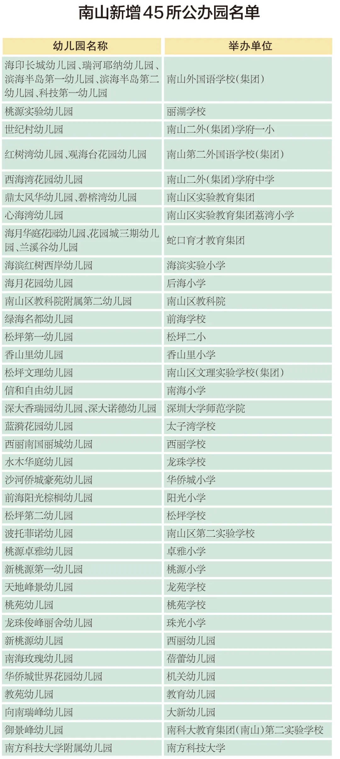 另外2所為新建幼兒園分別是由育才教育集團舉辦的蘭溪谷幼兒園、由南方科技大學教育集團舉辦的御景峰幼兒園,將于今年9月開學。還有41家民辦幼兒園均為政府產(chǎn)權到期移交,轉公辦園后,交由南山區(qū)各教育集團、學校和已有公辦園舉辦。