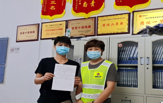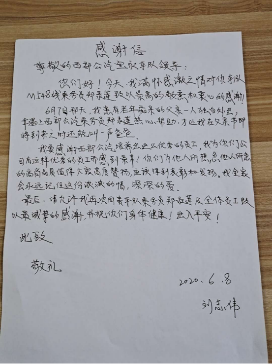 見圳客戶端·深圳新聞網(wǎng)2020年6月9日訊(深圳特區(qū)報(bào)記者 徐興東)6月9日早上,一位自稱劉先生的年輕人冒著滂沱大雨來到了西部公汽寶永車隊(duì)。一進(jìn)辦公室,劉先生雙手捧著將親筆寫的一封感謝信呈給了隊(duì)助張喜鳳,并深有感觸地說道:“多災(zāi)多難的父親有幸遇到乘務(wù)員鄭錄蓮的熱心幫助,并想方設(shè)法聯(lián)系上我。謝謝你們的成全,才讓我在父親節(jié)即將到來之時(shí)還能叫一聲爸爸,我將終生銘記諸位的大恩大德!”樸實(shí)無華的話語,感染了在場的每一個(gè)人,分明看出個(gè)個(gè)眼里都閃爍著晶瑩的喜悅淚花。
