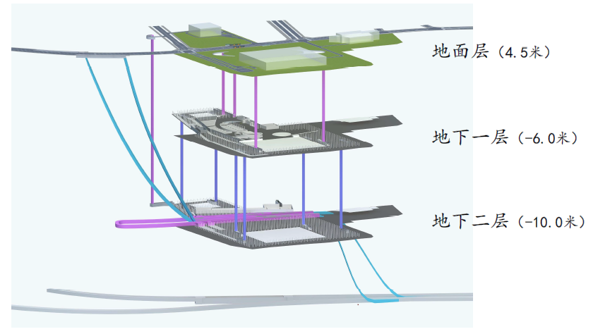 建議地下一層作為人行層和與地鐵銜接的交通樞紐層,地下二層作為主要交通層;在地下二層設置交通環(huán)島,實現(xiàn)地下空間與望海路地下快速路連接。