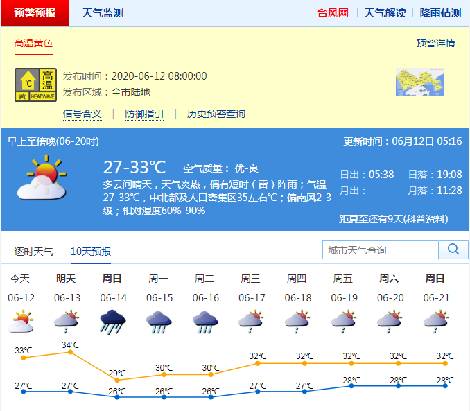 見圳客戶端·深圳新聞網(wǎng)2020年06月12日訊 深圳市氣象臺(tái)于2020年06月12日08時(shí)00分在全市陸地發(fā)布高溫黃色預(yù)警,預(yù)計(jì)12-13日深圳市最高氣溫將升至35℃以上,信號(hào)可能持續(xù)2天,做好防暑降溫工作,避免長時(shí)間戶外或者高溫條件下的作業(yè)。