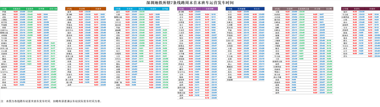 據(jù)介紹,周末期間1號(hào)線羅湖、機(jī)場東首班車時(shí)間提前至6:20,部分中間站的首班車最早提前至6:05左右;半程末班車服務(wù)延長至23:40分,分別從羅湖往前海灣、機(jī)場東往竹子林方向發(fā)車。2號(hào)線往新秀方向部分中間站首班車提前至6:00,往赤灣方向末班車延長至23:30。3號(hào)線部分中間站的首班車提前至6:05左右;半程末班列車服務(wù)保持原有的23:30,分別從益田往塘坑、雙龍往華新發(fā)車。9號(hào)線部分中間站的首班車最早提前至6:05左右;半程末班列車服務(wù)延長至23:30,分別從文錦至深圳灣公園、前灣至孖嶺發(fā)車。