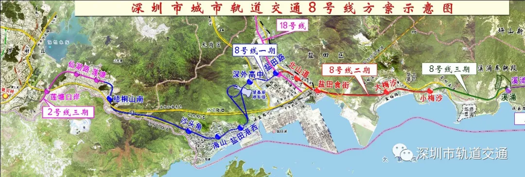地鐵8號線一期由2號線三期蓮塘站站后接出,終點設(shè)于鹽田港后方陸域的鹽田路站,線路長約12.36km,均采用地下敷設(shè)。線路共設(shè)車站6座,包含蓮塘主所和望基湖停車場。預(yù)計于今年底開通初期運營。
