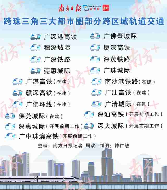 廣州、深圳“CP感”滿滿,通過(guò)廣深港高鐵、穗深城際、廣深鐵路等快速互聯(lián),最快半小時(shí)互通。而廣州地鐵28號(hào)線將連接佛山、廣州、東莞,支線還擬延伸至惠州。廣州地鐵18號(hào)線則規(guī)劃深入中山、珠海。肇慶、中山、江門(mén)、佛山等也紛紛“到深圳去”……