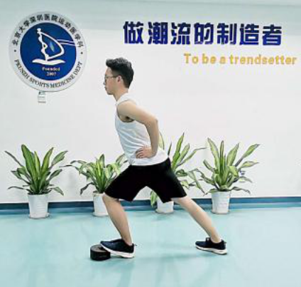 站姿拉伸,弓步站位,拉伸腳的腳掌踩在合適高度的墊片上,后半腳掌落地,雙手置于腰間保持平衡;身體前傾用力,保持30秒-60秒/次×3-5組。