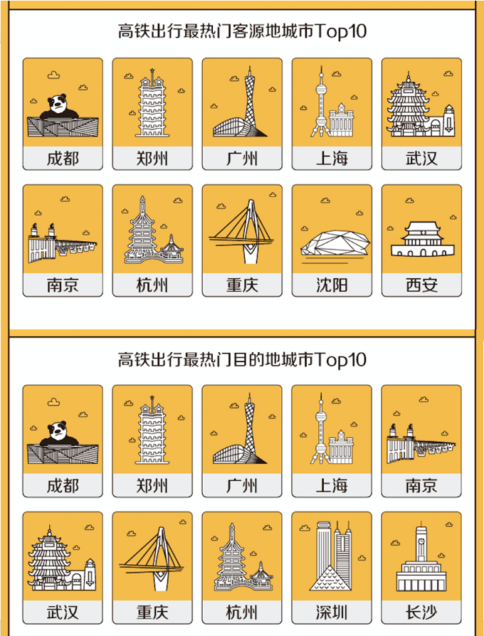 除此之外,城市周邊高鐵短途游受歡迎,特別是2小時(shí)內(nèi)的高鐵行程受到家庭出游的青睞。比如,上海開往杭州、蘇州、南京;廣州開往深圳、東莞、珠海;成都開往重慶、綿陽、眉山;武漢開往孝感、襄陽、黃石等城市短途高鐵線路預(yù)定量排名靠前。