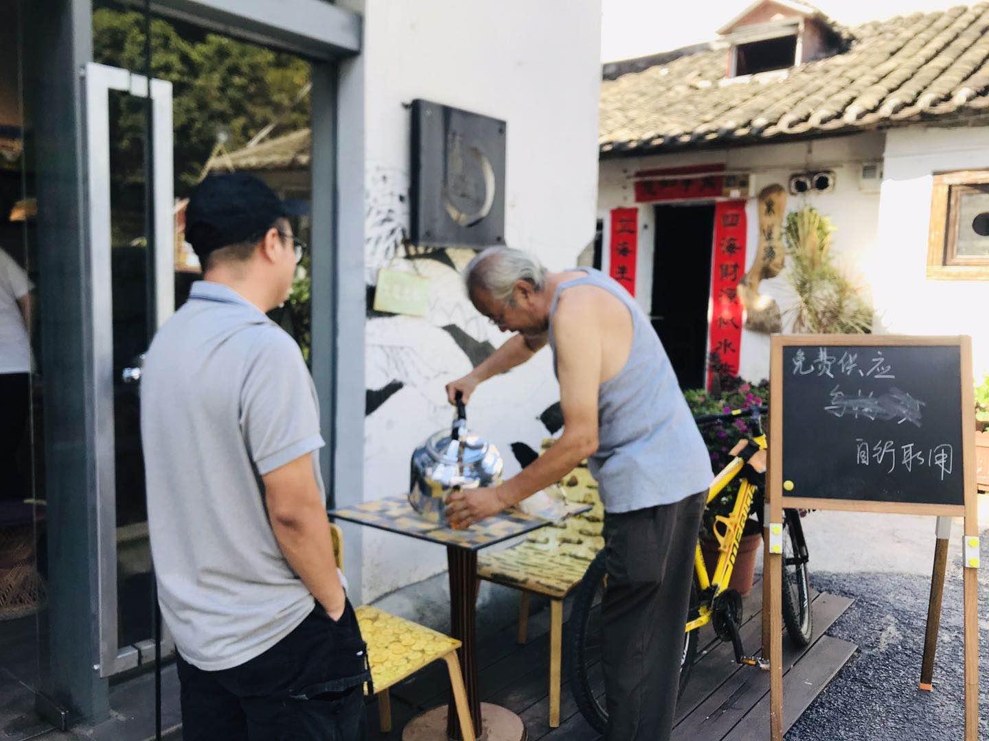 一張桌子、兩把椅子、一壺水就是一個涼茶點(diǎn),一旁支起的黑板上還寫著“免費(fèi)供應(yīng)、自行取用”八個字。這里的涼茶從下午三點(diǎn)半開始準(zhǔn)時向過往行人免費(fèi)提供,一直到晚上七八點(diǎn)。愛心涼茶供應(yīng)點(diǎn)的發(fā)起人叫陳小林,熟悉他的人都稱呼他小林哥。