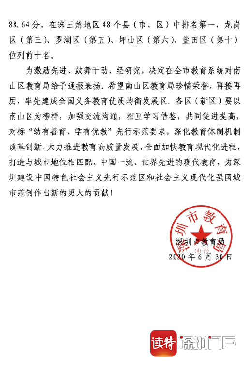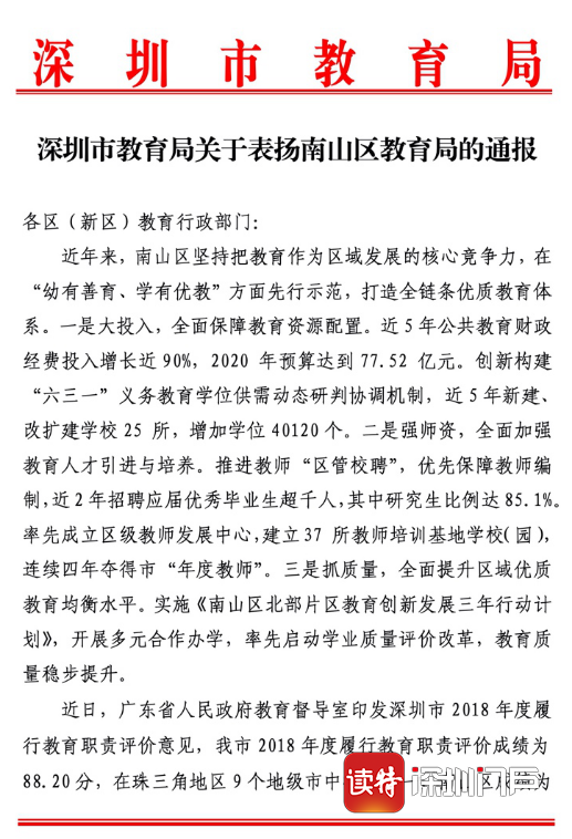 見圳客戶端·深圳新聞網2020年7月1日訊(深圳特區(qū)報記者 李麗)6月30日,《深圳市教育局關于表揚南山區(qū)教育局的通報》在全市教育界引起關注。通報表示,近日,廣東省人民政府教育督導室印發(fā)深圳市2018年度履行教育職責評價意見,深圳2018年度履行教育職責評價成績?yōu)?8.20分,在珠三角地區(qū)9個地級市中排名第一,其中,南山區(qū)成績?yōu)?8.64分,在珠三角地區(qū)48個縣(市、區(qū))中排名第一。經研究,決定在全市教育系統(tǒng)對南山區(qū)教育局給予通報表揚,并希望南山區(qū)教育局率先建成全國義務教育優(yōu)質均衡發(fā)展區(qū)。