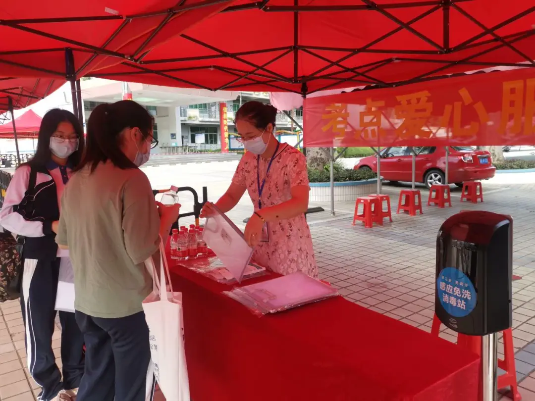 在現(xiàn)場,學(xué)校設(shè)有考點愛心服務(wù)站,為學(xué)生提供文件袋、口罩、礦泉水等物品。學(xué)校老師對前來領(lǐng)物資的學(xué)生說:“加油,祝你們考試順利!”