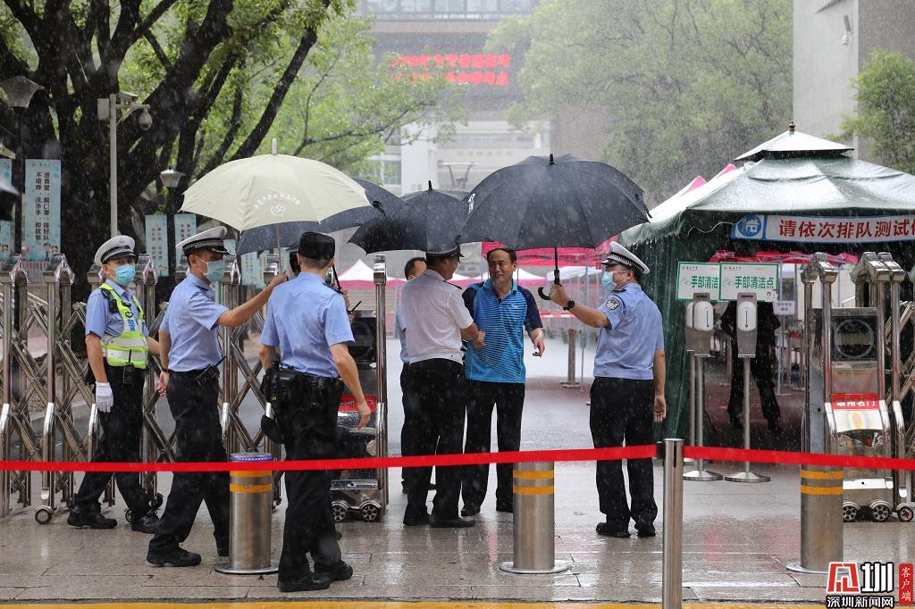上午11時(shí),深圳部分地區(qū)下起陣雨,交警在考點(diǎn)外了解現(xiàn)場情況。