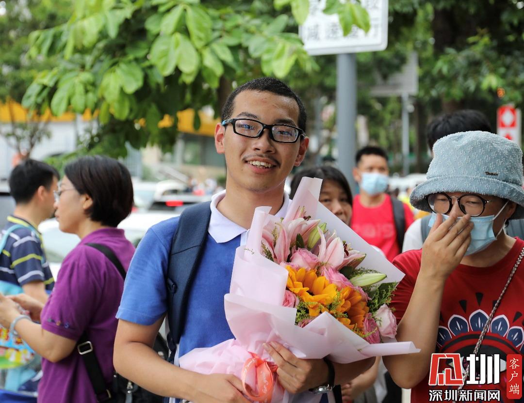 考生捧花慶賀高考結(jié)束,笑容洋溢。