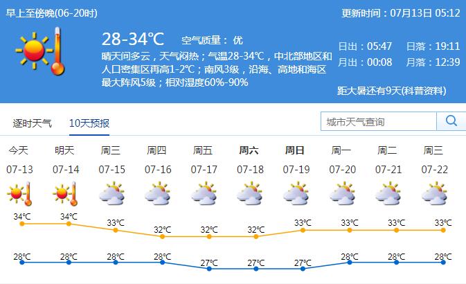 本周天氣持續(xù)晴熱。15-19日多云到晴天,偶有局地短時(雷)陣雨。全市(含深汕區(qū))高溫黃色預警信號生效中,天氣持續(xù)悶熱,注意防暑防曬。