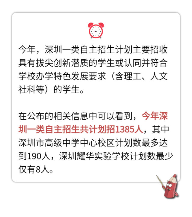 根據(jù)最新方案顯示,今年,深圳首次將公辦普通高中原體育、藝術特色團隊和體育、藝術術科特色班,民辦普通高中自主招生,全部納入普通高中學校自主招生計劃內(nèi)統(tǒng)籌安排。共有47所學校開展自主招生,按自主招生一類、自主招生二類設置招生類別。