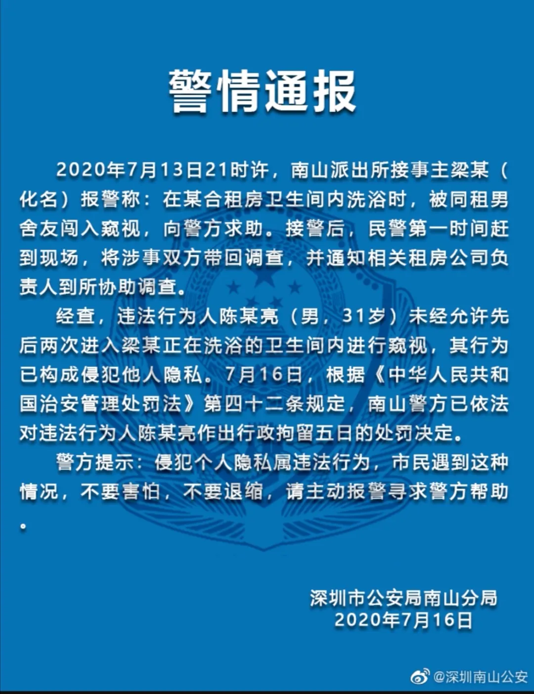 南山警方通報“女生合租房衛(wèi)生間洗浴被同租男舍友闖入”事件結果