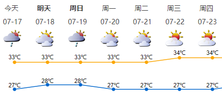我市多云,局部有短時(shí)(雷)陣雨;氣溫27-33℃,中北部地區(qū)最高氣溫34-35℃;南風(fēng)3-4級(jí),陣風(fēng)6級(jí);相對(duì)濕度60%-95%。