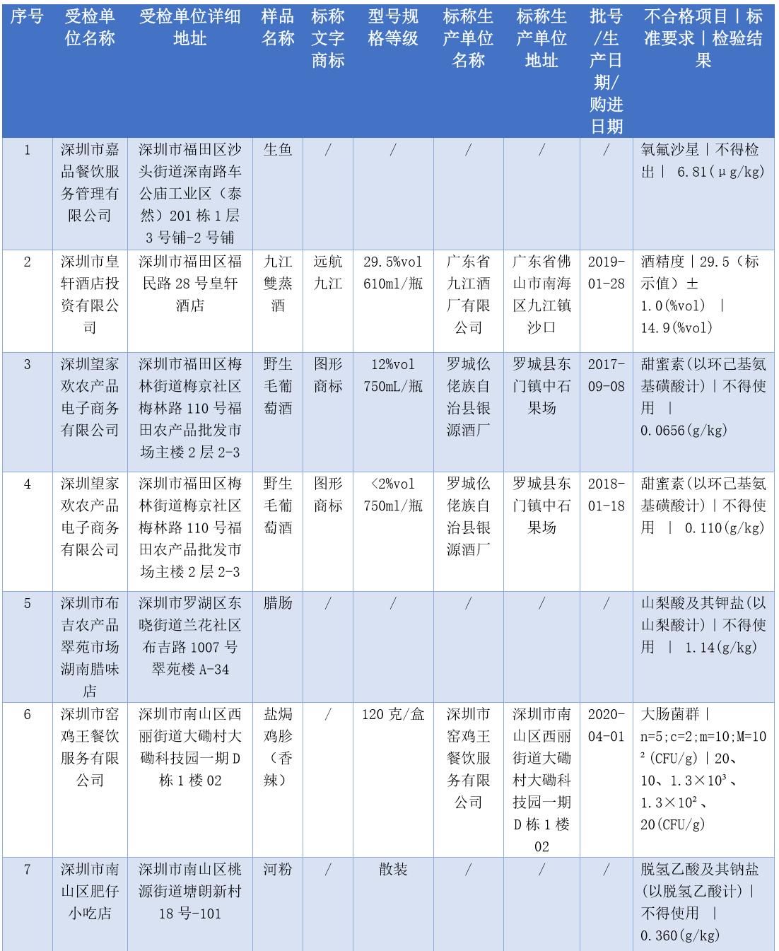 見圳客戶端·深圳新聞網(wǎng)2020年7月17日訊(晶報(bào)記者 鄧裴裴/制圖)7月17日,深圳市市場(chǎng)監(jiān)督管理局官網(wǎng)發(fā)布了2020年第二十二期食品安全抽樣檢驗(yàn)情況通報(bào),3-5月,共抽檢生產(chǎn)、流通、餐飲環(huán)節(jié)食品1229批次,發(fā)現(xiàn)不合格樣品47批次。記者注意到,不少不合格樣品抽檢單位為餐飲店,包括皇軒酒店、窯雞王、愛上牛蛙、御可奶茶等,還有些小吃店、腸粉店、螺獅粉店紛紛上榜。涉及不合格項(xiàng)目類別包括農(nóng)藥殘留、獸藥殘留、食品添加劑、微生物污染、品質(zhì)指標(biāo)、金屬等元素污染物。