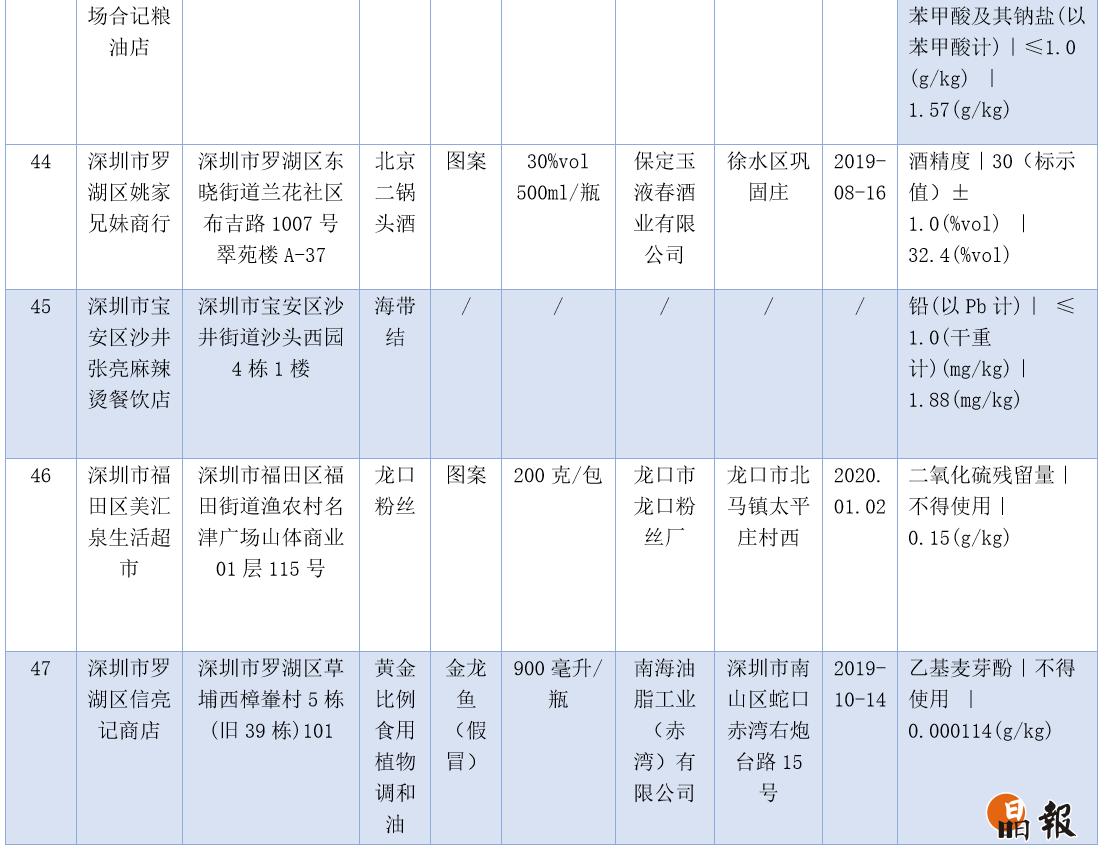 本次不合格樣品涉及的食物種類較多,臘腸、雞蛋、榨菜、酒等都檢出問題,值得注意的是,羅湖區(qū)草埔西樟輋村信亮記商店出售假冒的金龍魚油,檢出了不得使用的乙基麥芽酚,其標(biāo)稱生產(chǎn)企業(yè)為南山區(qū)南海油脂工業(yè)(赤灣)有限公司,后經(jīng)核實(shí),不合格產(chǎn)品非該公司生產(chǎn)。