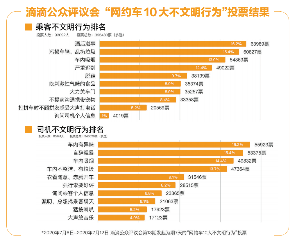 為進(jìn)一步優(yōu)化平臺(tái)規(guī)則和治理方向,滴滴公眾評(píng)議會(huì)第13期發(fā)起為期7天(7月6日至7月12日)的“網(wǎng)約車(chē)10大不文明行為”公眾投票和意見(jiàn)征集。本次活動(dòng)累計(jì)178216人次投票,收到4533條用戶留言,用戶分享了打車(chē)中遇到的遭遇,并積極獻(xiàn)言獻(xiàn)策。其中,共93092人次參與乘客不文明行為投票,共投出395483票,乘客酒后滋事以63989票高居“網(wǎng)約車(chē)10大不文明行為”榜首,污損車(chē)輛、亂扔垃圾獲得60827票,車(chē)內(nèi)吸煙54869票,排名第三。