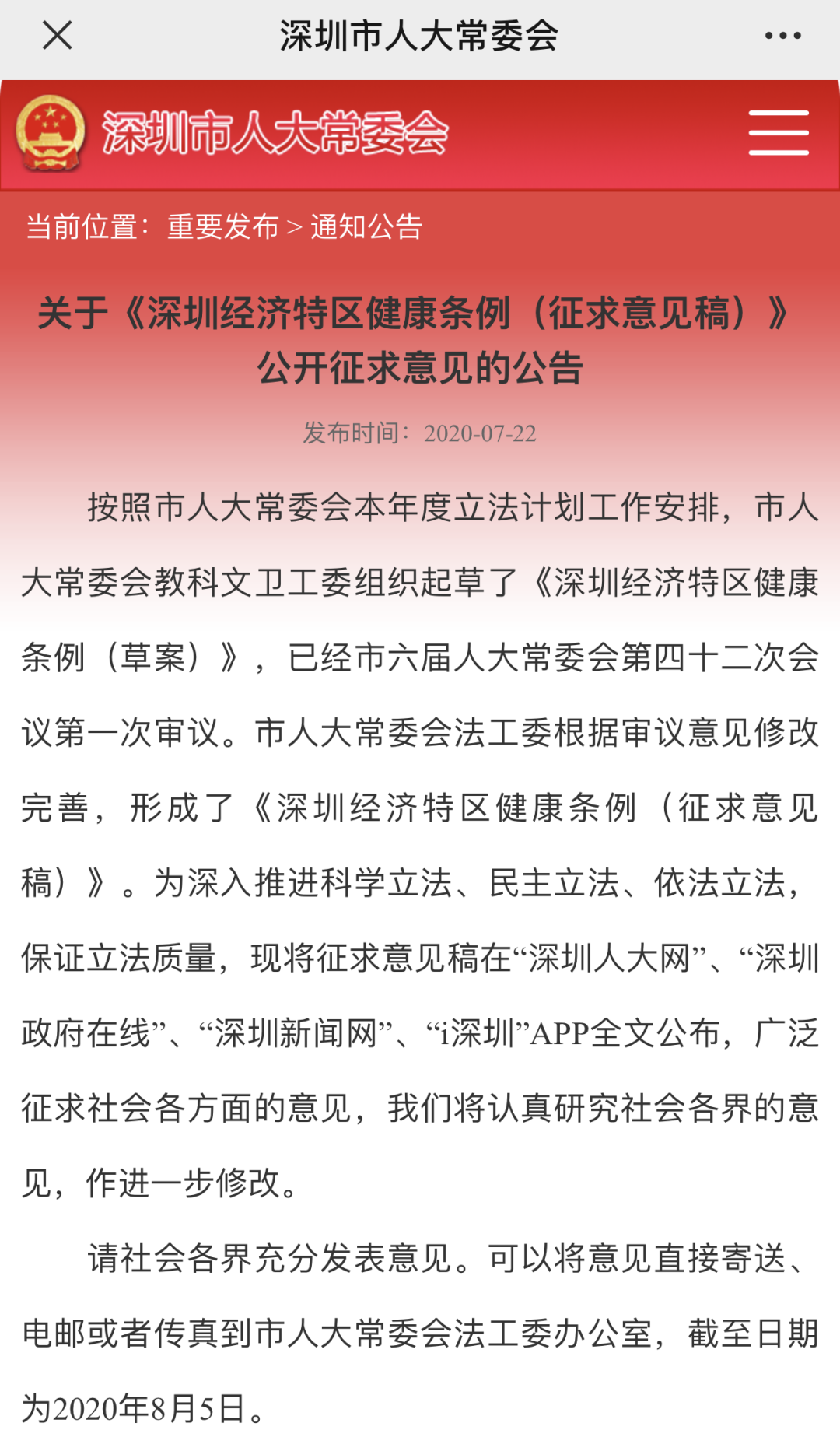 7月22日下午,該條例的征求意見稿在深圳市人大官網(wǎng)公布,向公眾征求意見。
