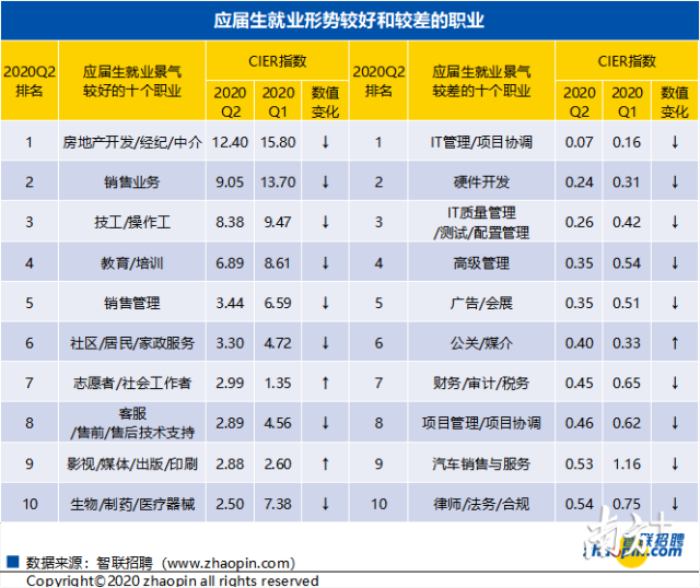 南方網(wǎng)2020年7月29日訊 受年初疫情影響,應(yīng)屆生以往春季求職“黃金期”也相應(yīng)推遲,本季度應(yīng)屆生就業(yè)市場(chǎng)競(jìng)爭(zhēng)激烈。近日,智聯(lián)招聘發(fā)布《2020年第二季度應(yīng)屆生就業(yè)市場(chǎng)景氣報(bào)告》(下稱《報(bào)告》),顯示新職業(yè)、新基建人才缺口較大,成為應(yīng)屆生就業(yè)增長(zhǎng)點(diǎn);教育/培訓(xùn)職業(yè)就業(yè)較好,財(cái)務(wù)、法律求職競(jìng)爭(zhēng)激烈;一線、新一線城市求職競(jìng)爭(zhēng)激烈、二、三線城市就業(yè)較好。