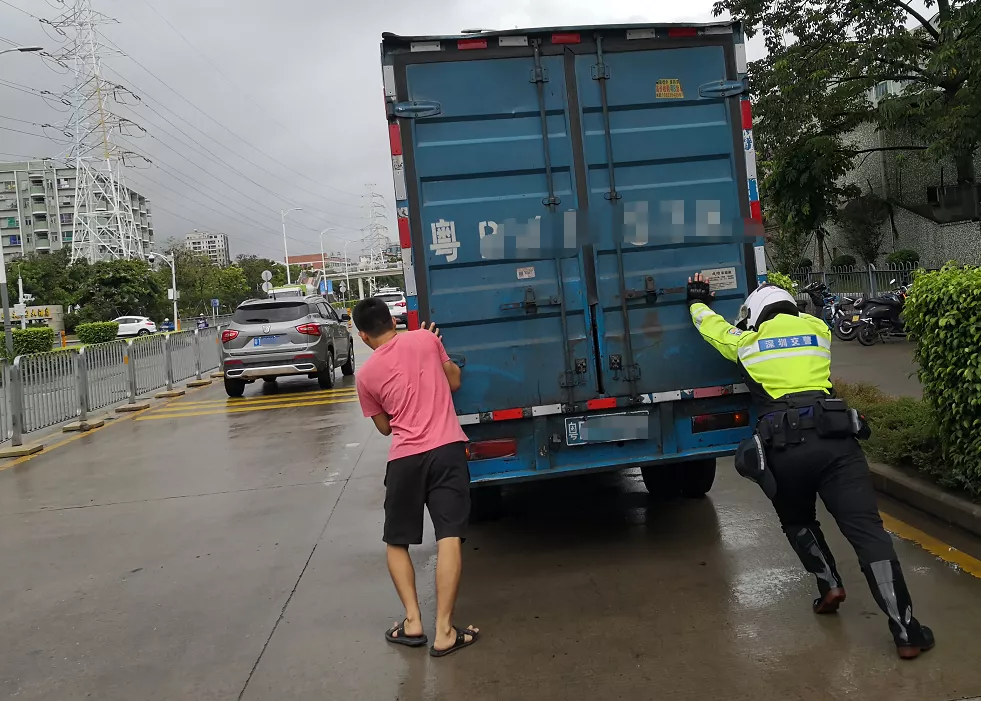 8月5日9時(shí)30分許,深圳交警鐵騎隊(duì)員雨中巡邏至新沙路時(shí),發(fā)現(xiàn)德昌電機(jī)廠路段有一輛貨車(chē)停在路上,導(dǎo)致交通擁堵。貨車(chē)司機(jī)在旁,鐵騎上前詢(xún)問(wèn)情況后得知貨車(chē)故障,司機(jī)被迫將車(chē)停在路邊。