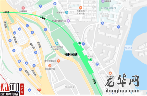 梅林關站位于梅觀路與豐澤湖小區(qū)之間綠化帶內(nèi),整體與梅觀路平行,呈南北走向,車站南端頭至星河丹堤小區(qū)內(nèi),北端頭至梅林關檢查站出關口處,西側緊靠梅觀路。