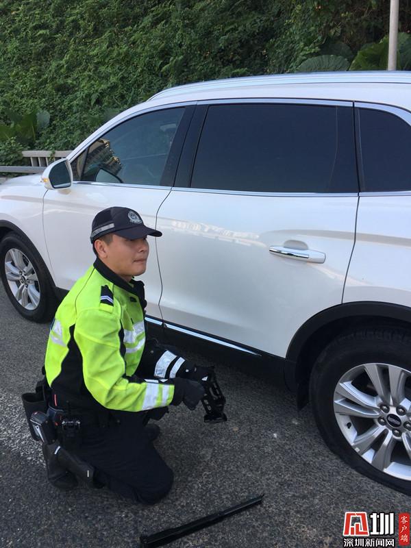 事情發(fā)生在10月11日早上10時(shí)30分許,劉先生駕車出外辦事,車輛行駛至東環(huán)高架西往東方向時(shí),突然一聲巨響左后輪輪胎爆裂車輛半路拋錨,當(dāng)時(shí)正值交通早高峰,過往車輛不斷,故障車輛停在道路中間導(dǎo)致路段交通擁堵,車主劉先生一時(shí)間不知所措,只能留在原地等待救援。此時(shí)正在執(zhí)行巡邏任務(wù)的羅湖交警鐵騎組長(zhǎng)陳展廷見狀,立即停下警車上前查看情況,了解情況后,為了緩解該路段的交通擁堵,防止出現(xiàn)交通意外,陳展廷立即讓劉先生把車??吭谧钣覀?cè)車道,然后安排隊(duì)員用警車在故障車輛周邊設(shè)置出了安全警戒區(qū)域,另一位隊(duì)員則對(duì)過往車輛進(jìn)行指揮疏導(dǎo)及勸慰駕駛?cè)瞬灰保诎踩珔^(qū)域等待,陳展廷則俯下身為爆胎車輛更換輪胎。約15分鐘的忙碌后,三位鐵騎隊(duì)員已滿身是汗,但在他們的密切協(xié)調(diào)配合下,快速幫助駕駛?cè)藙⑾壬鷶[脫困境,險(xiǎn)情在最短時(shí)間內(nèi)被及時(shí)排除,道路交通秩序也恢復(fù)正常,這暖心一幕讓劉先生很是感動(dòng),緊緊握著陳展廷同志的手連聲表示感謝。
