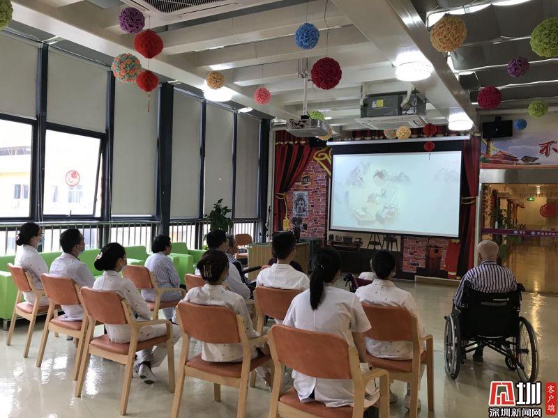 羅湖區(qū)醫(yī)養(yǎng)融合老年病醫(yī)院值班醫(yī)護人員與老人共同觀看《銘記,是為了更好前行》。