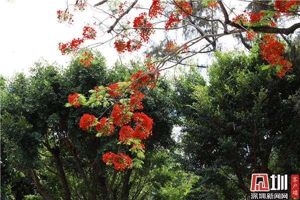 見圳客戶端·深圳新聞網(wǎng)5月18日訊(記者 李慧 見習(xí)記者 郝鈺詩 )又是一年五月天,春已盡,夏未央。伴隨深圳夏季而來的還有熱烈的鳳凰花?!叭~如飛凰之羽,花若丹鳳之冠。”在深圳的許多地方,都種植了鳳凰木,五六月夏初之際,鳳凰花便開始掛滿枝頭,抬頭仰望便是紅彤彤的一片,就像太陽遺落在人間的衣裳,點綴著灣區(qū)之光。5月18日,深圳新聞網(wǎng)記者來到深圳東湖公園和洪湖公園,用鏡頭定格鳳凰花之美。