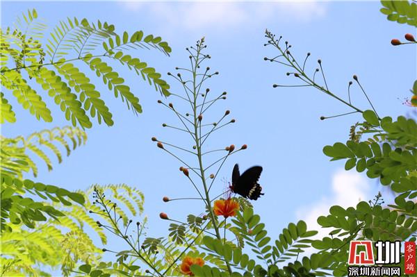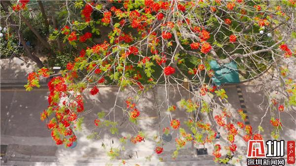 五月綻放全城的鳳凰花,映射著深圳這座城市的繁華與熱情,同時也給這座城市帶來勇敢熱烈的色彩。從鏡頭中可見,鳳凰花花團緊簇,在藍天的襯托下,那一簇簇火紅的花海張揚而又高調(diào)地綻放,為深圳“藍”染上了一抹紅。