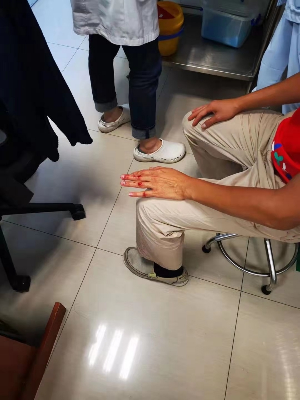 心中著急的梁國輝剛上路不久,突然間精神恍惚,車頭沒把穩(wěn),等反應過來已經趴在地上了。網格員王勇剛好路過,扶起梁國輝送到社康止血與包扎。社康醫(yī)生一邊處理一邊對他說:“傷口比較深,現(xiàn)在幫你止血,等一下必須去留醫(yī)部急診處理一下,牙齒也缺了兩塊,怎么傷得那么重呀?”“昨天加班熬夜了,沒睡好,給你添麻煩了?!绷簢x不好意思地說道,社康醫(yī)生笑著安撫他:“大家都是兄弟姐妹,我們昨天不是一起在繽紛時代加班驗核酸…”原來社康醫(yī)生正是此前與自己一起在疫情防控工作的小伙伴之一,便安下心來接受治療。