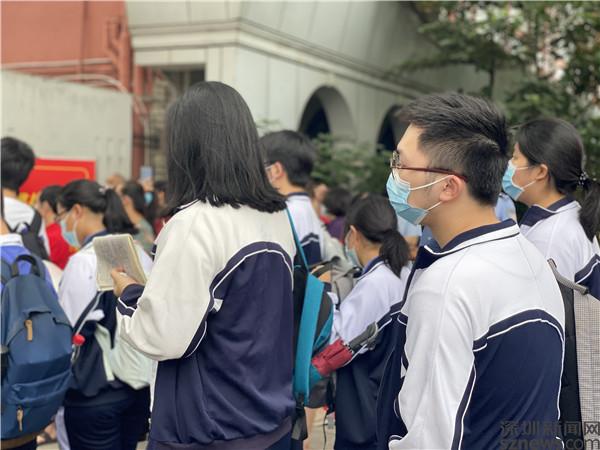 當(dāng)天上午7:50,記者來到羅湖區(qū)翠園中學(xué)和羅湖外語學(xué)校門口,只見考生們已陸續(xù)排隊(duì)領(lǐng)取準(zhǔn)考證,有序進(jìn)入考場。許多穿著“紅旗袍”戴著“紅口罩”的家長們在紛紛叮囑孩子們后,已在校門口等候。