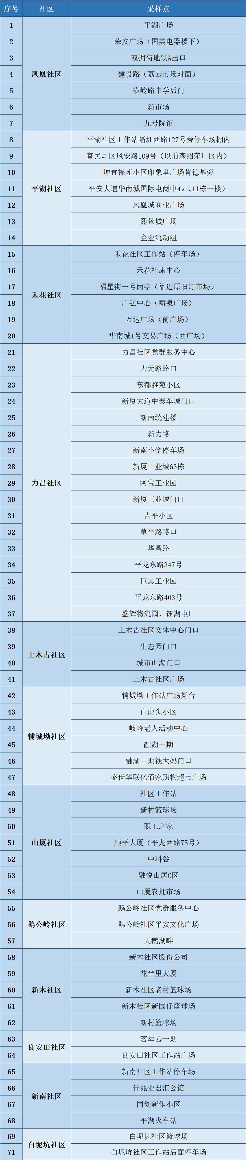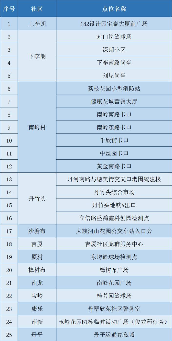 根據(jù)疫情防控需要,為最大程度保障人民群眾生命安全和身體健康,龍崗區(qū)各街道于1月10日開展新一輪免費(fèi)核酸檢測以下點位統(tǒng)計截至1月10日。各點位動態(tài)更新請以社區(qū)通知及現(xiàn)場實際情況為準(zhǔn)。
