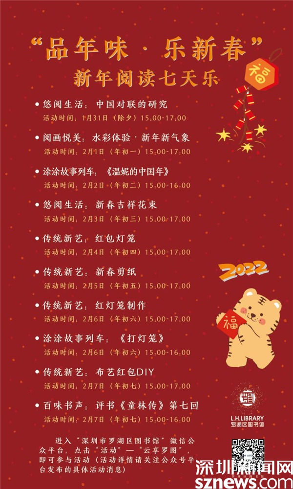 讀特客戶端·深圳新聞網(wǎng)2022年1月28日訊(記者 劉嘉敏 通訊員 張蕾)壬寅年春節(jié)將至,為了營造喜慶、歡樂、祥和的節(jié)日氛圍,羅湖區(qū)圖書館推出一系列豐富多彩的新春文化活動,讓留深讀者在新春佳節(jié)里盡享文化“大餐”。