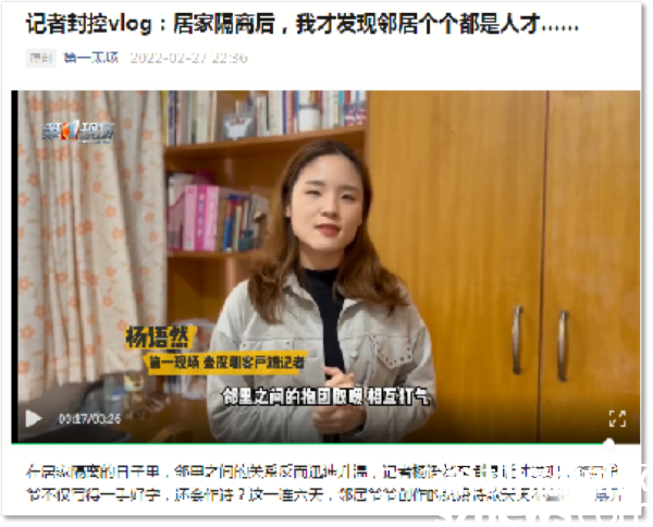 住在華瑞大廈A座封控區(qū)的第一現(xiàn)場記者楊語然,每天拍攝視頻記錄封控生活。在她的鏡頭下,封控區(qū)防疫工作有條不紊,民生服務暖心到位,鄰里之間抱團取暖、相互打氣。她表示,因為這段“特殊的”居家隔離時光,鄰里之間的關系反而迅速升溫,每天在微信群里互動,才知道住在一起的鄰居們那么多才多藝。