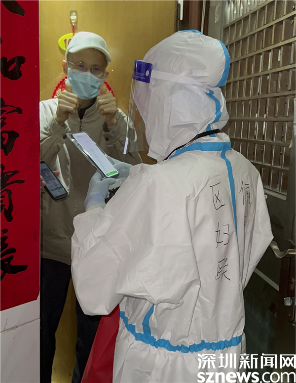 3月22日,黃貝嶺下村封控區(qū),婦聯(lián)抗疫隊(duì)員們分成幾個(gè)小組,上門(mén)為居民登記信息,協(xié)助醫(yī)護(hù)人員采核酸,這是他們第二天在同一地址上門(mén)服務(wù)。
